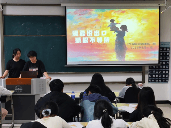 “同學們,猜一猜明天是什么節日啊?”“母親節!”5月11日,新聞傳播學類專業2023(7)、(8)班在K202教室開展以“愛要說出口,感恩不等待”為主題的團建活動。活動開始前,活動負責人、新聞傳播學類專業2023(7)、(8)班的班長楊雨霏、朱研溪提前為每位同學準備好信紙和信封。朱研溪說:“我們希望通過寫信這種傳統而深情的溝通方式,讓同學們勇敢表達自己的心聲,將對母親的愛訴說于筆尖。”學生們觀看一段關于母愛的感人短片后,...